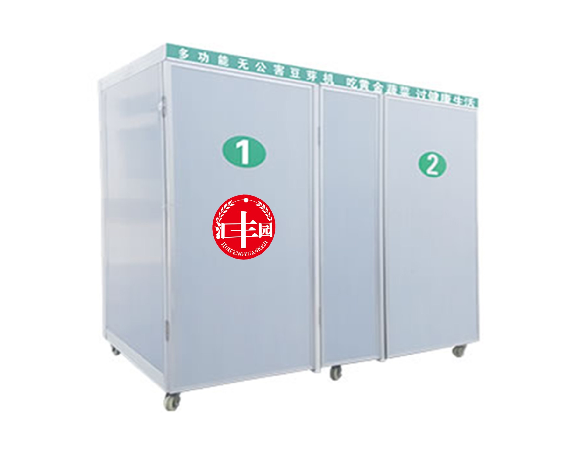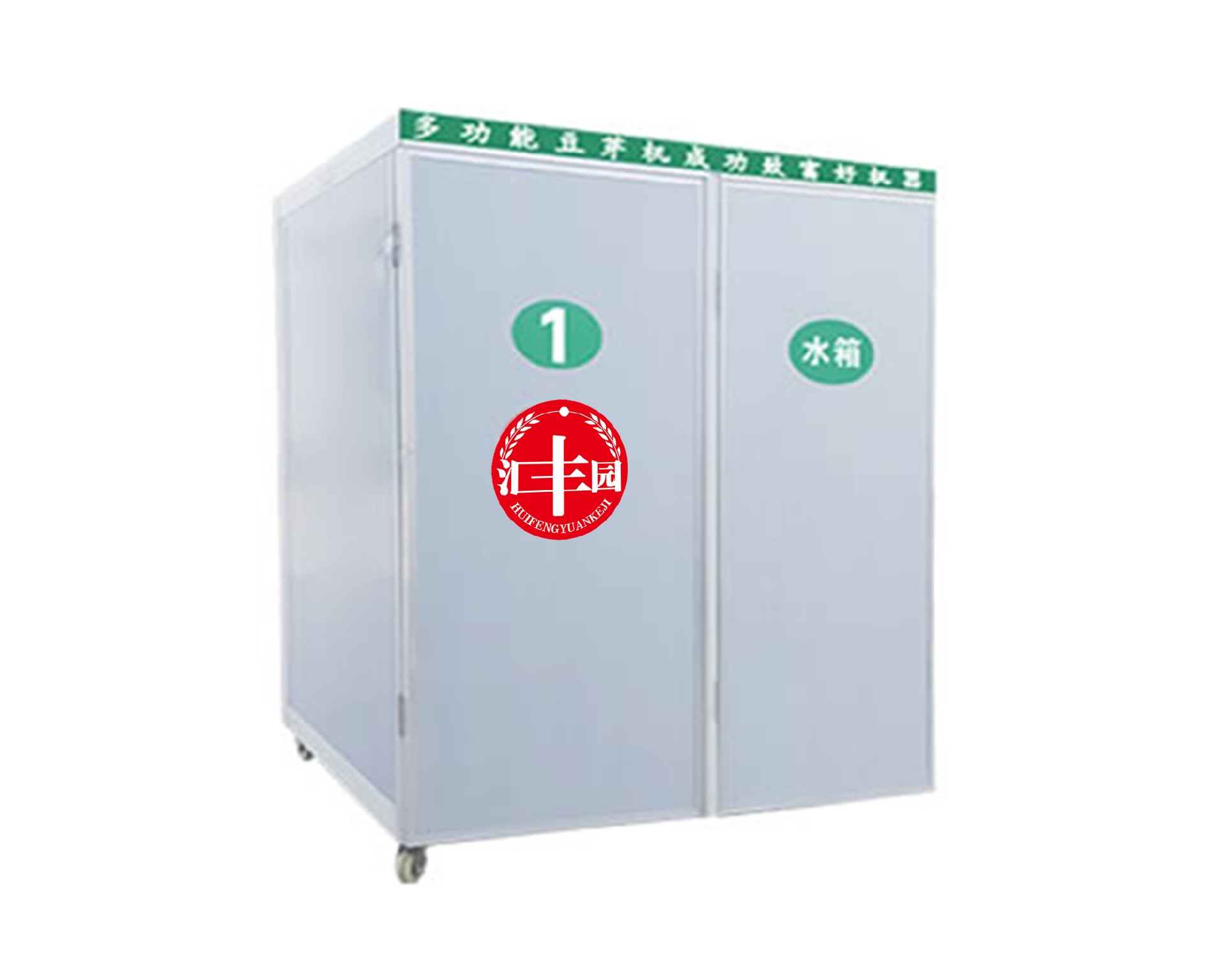 本设备箱体为保温、防水、防锈的复合彩钢板,内部框架为不锈钢。独立电脑可实现:缺水报警、自动加水; 箱体:温度显示、高温报警、箱体自动加温、恒温、箱体空气循环; 水箱:温度显示、高温报警、水箱自动加水、自动加温、恒温、自动淋水、淋水间隔时间显示、淋水延时显示、手动淋水的自控高智能豆芽机。生产时仅需将泡好的种豆放入机内保温箱、循环放豆,天天出产品。广泛适用于食堂、超市、饭店、宾馆、及农贸市场、部队生活中心等。