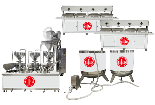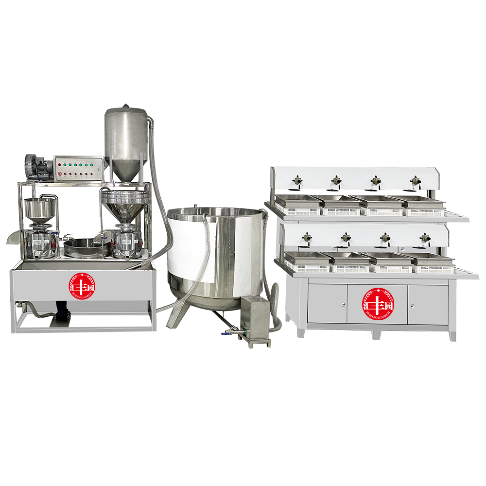 我公司生产豆腐机在国内是较早的企业,多年来通过对设备的不断改进,利用现代科技与传统工艺的完美结合。使设备外观设计美观、智能化高,操作简单,主要有自动上豆系统、磨浆机系统、拌渣提升系统、煮浆桶(蒸气机用户自备)、成型机等组成。机器采用不锈钢制造,干净卫生,技术领先,质量可靠,经久耐用。实现了批量生产过程自动化,具有高效、省时、耗能低等优点。采用先进空真上豆技术和连续磨浆技术,瞬间加热工艺,保证了蛋白质不受破坏,从而使生产出来的豆制品营养更丰富,味道更鲜美。工艺流程: 将浸泡好的黄豆由高速分离磨浆机加工,排出豆渣,产出的豆浆经过蒸汽加热达到去腥,并煮浆均质,并添加辅助原料消泡、凝固剂(如卤水、石膏、内脂、酸浆等)、成型和深加工处理便可产生出营养丰富的豆制品如:豆浆、豆腐脑、豆腐、豆杆、豆皮、素鸡、豆泡等制品,适用于大型宾馆、超市、企业食堂、工程店及食品厂批量加工使用。