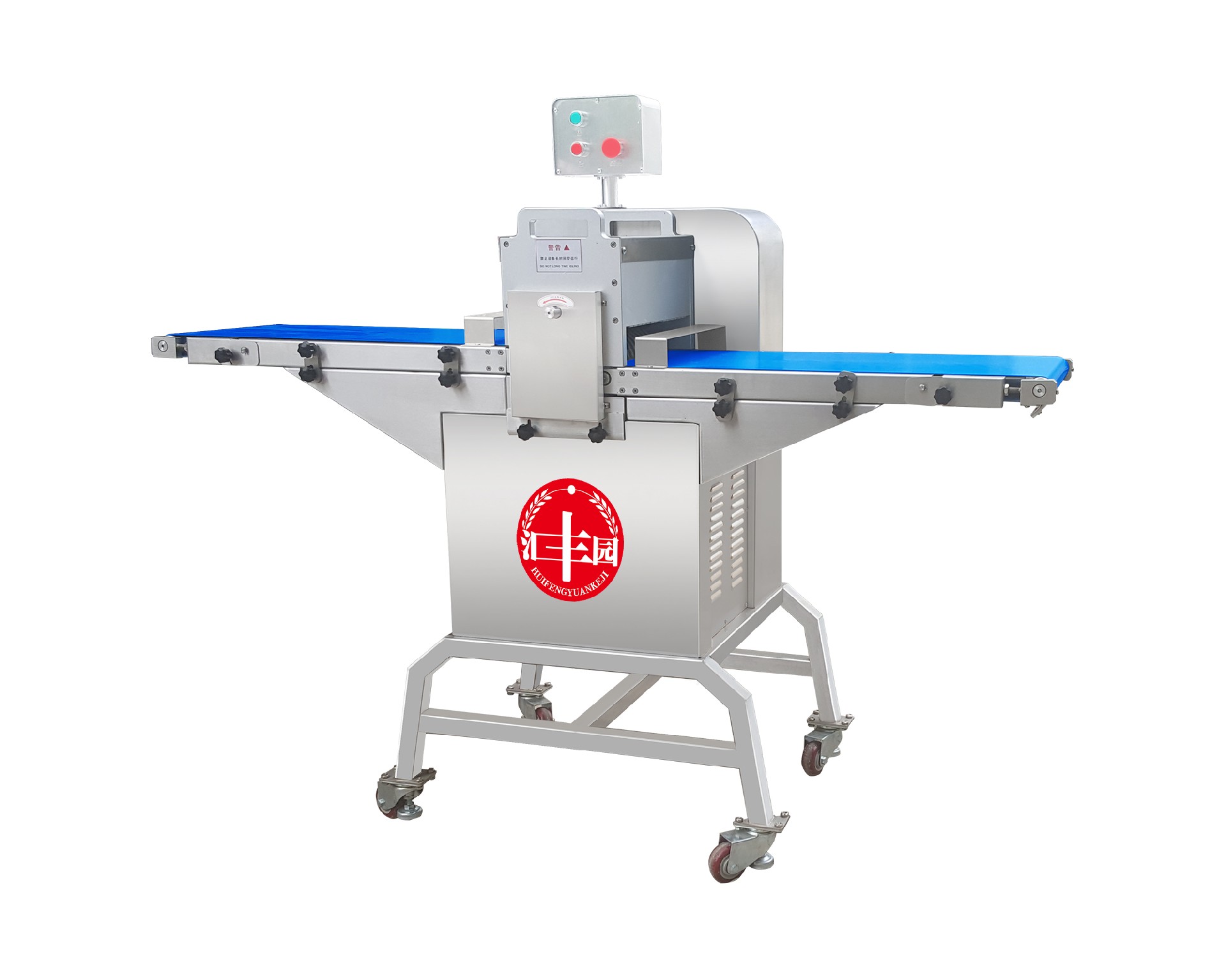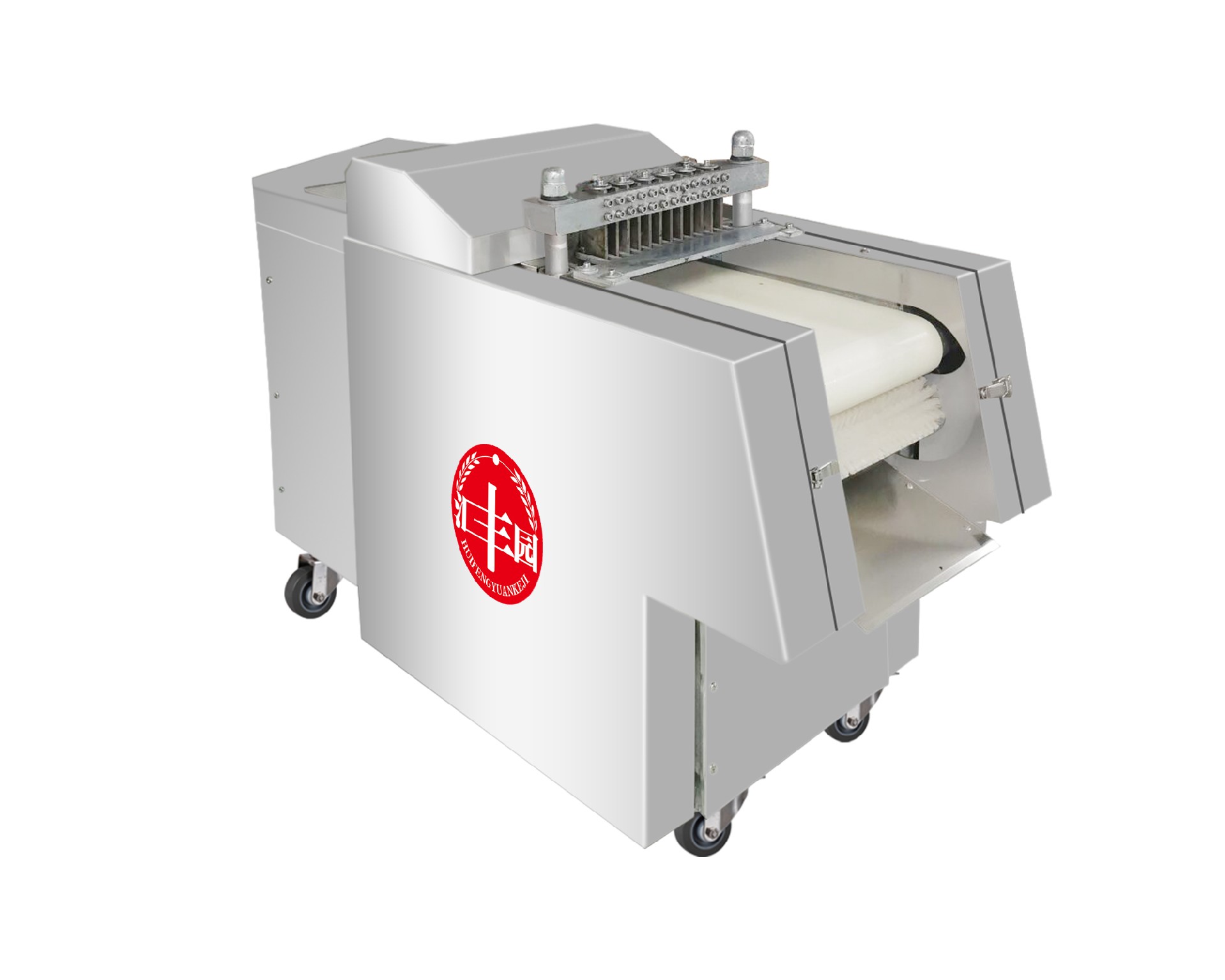 采用输送带进料、出料,切片厚度可按照用户要求制作,可快速更换不同的刀组,满足用户各种规格的切片要求。能快速拆装进、出料输送带及圆刀片组,整机采用防水设计,全不锈钢制作,可直接用水冲洗机器。产品切割整齐,误差非常小,方便操作,能实现产品快速包装。标配尺寸25毫米;其它尺寸可定做。鸡鸭禽类可带骨切割为块状。